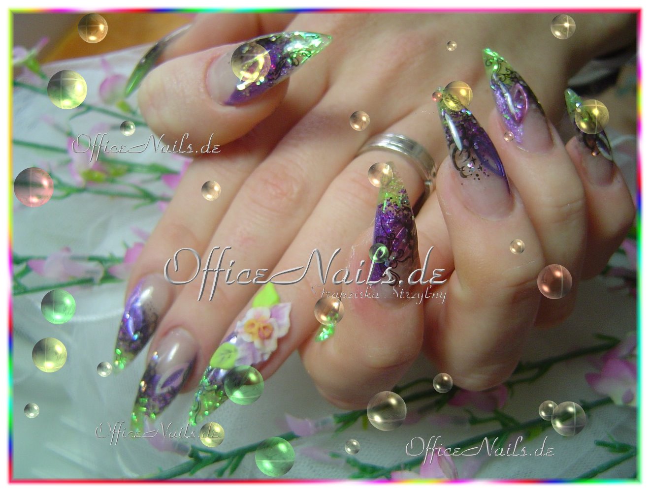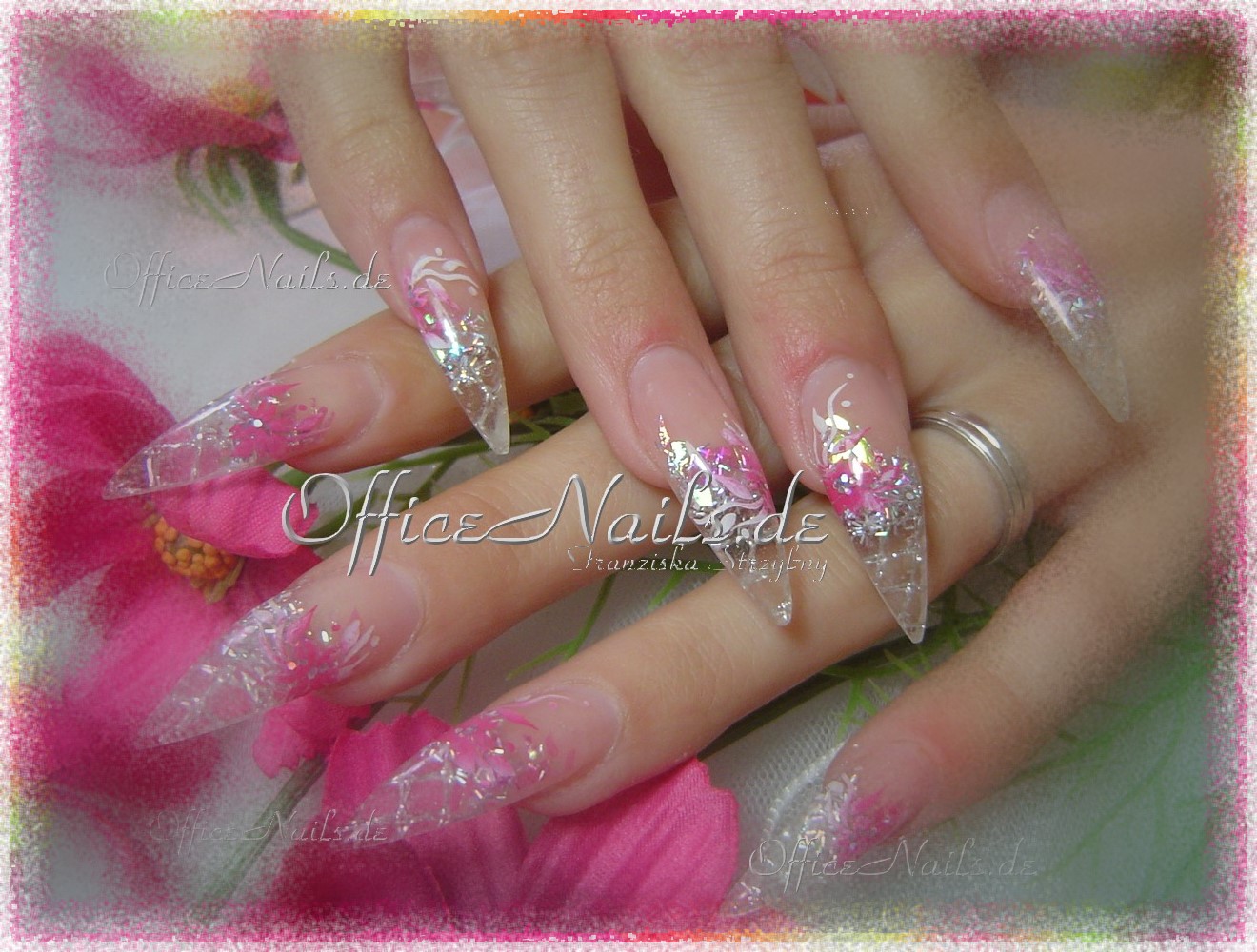 Glitterfädchen und crushed ice, sowie Blütenranken.